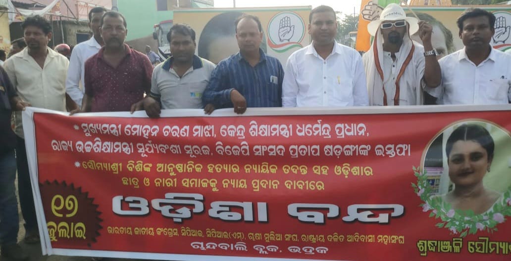 କଟକ(ଉତ୍କଳ ନିଉଜ)୧୭/୦୭/୨୦୨୫ : ନିର୍ଯ୍ଯାତନାର ଅଗ୍ନିରେ ଦଗ୍ଧ ଫକୀର ମୋହନ ସ୍ୱୟଂ ଶାସିତ ମହାବିଦ୍ୟାଳୟ ଛାତ୍ରୀ ସୌମ୍ଯାଶ୍ରୀ ବିଶି ଙ୍କ ଆନୁଷ୍ଠାନିକ ହତ୍ୟାର ଅଭିଯୁକ୍ତ ମାନଙ୍କୁ ଗିରଫ, ଏହି ଘଟଣାରେ ମୁଖ୍ୟମନ୍ତ୍ରୀ ମୋହନ ଚରଣ ମାଝୀ, କେନ୍ଦ୍ର ଶିକ୍ଷା ମନ୍ତ୍ରୀ ଧର୍ମେନ୍ଦ୍ର ପ୍ରଧାନ, ରାଜ୍ୟ ଉଚ୍ଚଶିକ୍ଷା ମନ୍ତ୍ରୀ ସୂର୍ଯ୍ୟବଂଶୀ ସୂରଜ, ବାଲେଶ୍ବର ସାଂସଦ ପ୍ରତାପ ଷଡଙ୍ଗୀ ଓ ବାଲେଶ୍ବର ସଦର ବିଧାୟକ ଇସ୍ତଫା ଦେବା, ଏହି ଘଟଣାର ନ୍ୟାୟିକ ତଦନ୍ତ ଦାବି କରି ଧାମରା ବନ୍ଦର, ଧାମରା ମତ୍ସ୍ଯ ପୋତାଶ୍ରୟ, ଚାନ୍ଦବାଲି ବଜାର, ଘଣ୍ଟେଶ୍ୱର ବଜାର, ମତୋ ବଜାର, ଦିଗଛିଆ ବଜାର, ରାଜ୍ୟ ରାଜପଥ, ଚାନ୍ଦବାଲି ମହାବିଦ୍ୟାଳୟ, ଘଣ୍ଟେଶ୍ୱର ମହାବିଦ୍ୟାଳୟ, ମତୋ ମହାବିଦ୍ୟାଳୟ, ବ୍ଲକର ସମସ୍ତ ବିଦ୍ୟାଳୟ, ବ୍ଲକ କାର୍ଯ୍ୟାଳୟ, ତହସିଲ କାର୍ଯ୍ୟାଳୟ, ଚାନ୍ଦବାଲି କୋର୍ଟ, ଏନ୍ ଏ ସି କାର୍ଯ୍ୟାଳୟ ଆଦି ବଂଦ ରହିଥିଲା । ଏହି ବଂଦକୁ ଚାନ୍ଦବାଲି ବ୍ଲକବାସୀ ସ୍ୱତଃ ଭାବେ ସଫଳ କରିଥିଲେ।